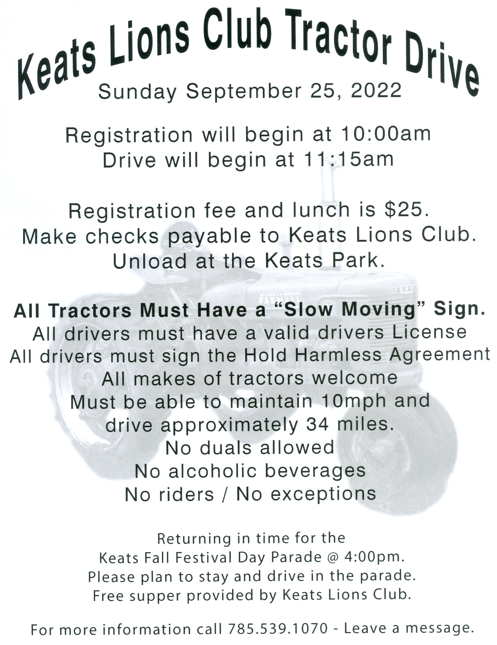| 9/25 | Keats Lions Cljub Tractor Drive. Registration 10 AM See Details. | 10 AM |